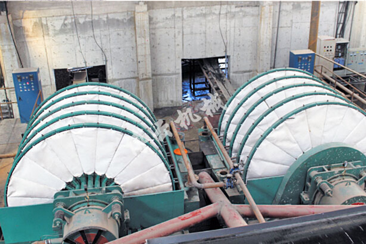 盤式真空過濾機(jī)由各個(gè)單獨(dú)的扇形片的圓盤構(gòu)成。每一個(gè)扇形片為單獨(dú)的過濾單元,由濾布做成布套在扇形片上形成濾室。過濾盤由電機(jī)通過減速器及開式齒輪傳動(dòng)來驅(qū)動(dòng),過濾盤順時(shí)針方向轉(zhuǎn)動(dòng),濾室里的礦漿在吸附區(qū)借助于真空泵在過濾介質(zhì)兩側(cè)形成的壓力差,附著在過濾盤上形成濾餅后,攪拌器旋轉(zhuǎn)防止固體沉淀,濾餅離開液面后,在真空作用下繼續(xù)脫去水分。濾液透過濾布,經(jīng)過濾液管,從分配頭排出。濾餅在卸料區(qū)由反吹風(fēng)卸料落入排料槽,整個(gè)作業(yè)過程連續(xù)循環(huán)進(jìn)行。