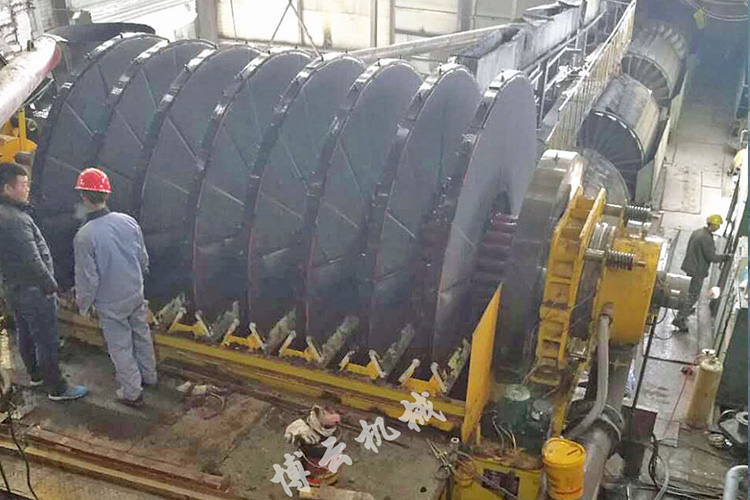 盤式真空過濾機由各個單獨的扇形片的圓盤構(gòu)成。每一個扇形片為單獨的過濾單元,由濾布做成布套在扇形片上形成濾室。過濾盤由電機通過減速器及開式齒輪傳動來驅(qū)動,過濾盤順時針方向轉(zhuǎn)動,濾室里的礦漿在吸附區(qū)借助于真空泵在過濾介質(zhì)兩側(cè)形成的壓力差,附著在過濾盤上形成濾餅后,攪拌器旋轉(zhuǎn)防止固體沉淀,濾餅離開液面后,在真空作用下繼續(xù)脫去水分。濾液透過濾布,經(jīng)過濾液管,從分配頭排出。濾餅在卸料區(qū)由反吹風(fēng)卸料落入排料槽,整個作業(yè)過程連續(xù)循環(huán)進行。